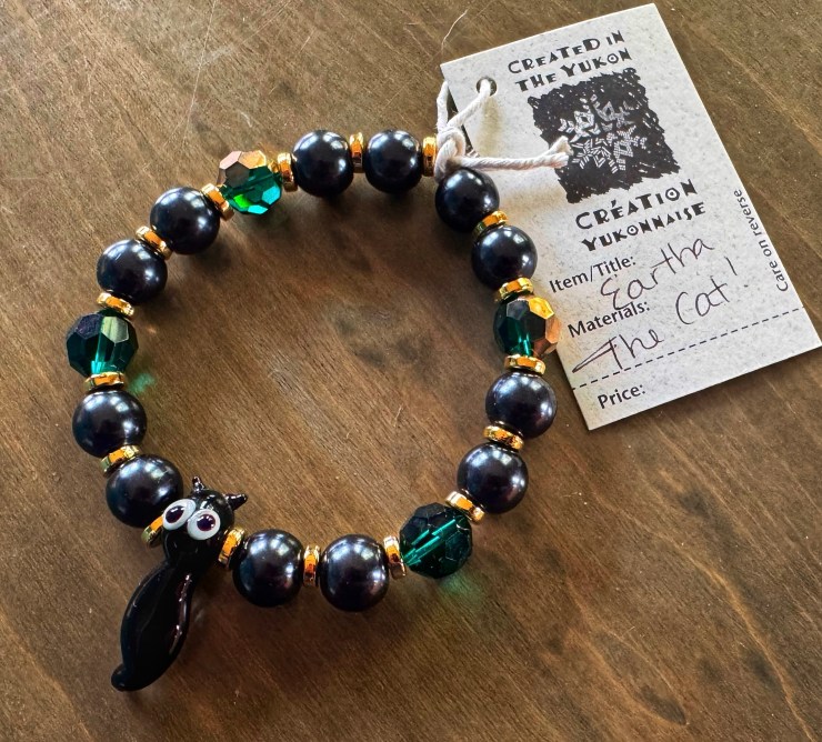 It’s fun when the beads match the personality of the person for whom the jewellery is created (lampwork bead with crystals and glass beads: classy and unique). This tag should read Eartha the Kitty 🐈⬛ and this bracelet – which I doubt Eartha will wear, but hopefully will admire on her owner’s wrist – is on its way to brighten a friend’s day!